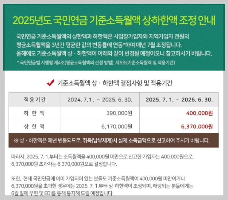 이번 국민연금 기준소득월액 조정은 2025년 7월부터 1년간 적용되며,