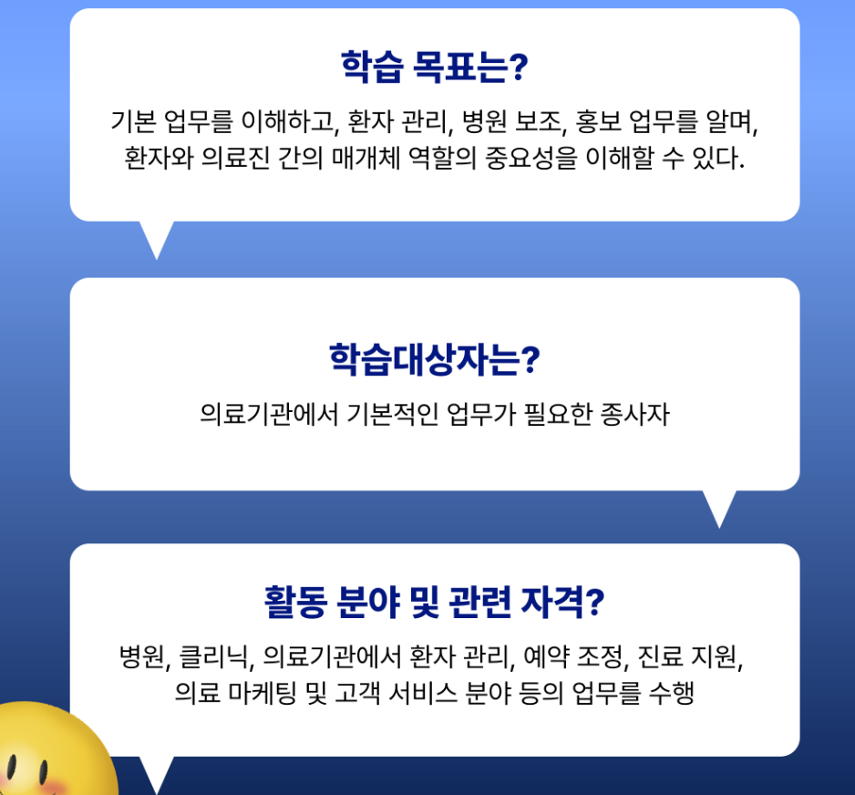 → 커리큘럼: 환자 응대, 병원 시스템 이해, 의료 서비스 매뉴얼 등 - 과제·시험 제출 후 수료