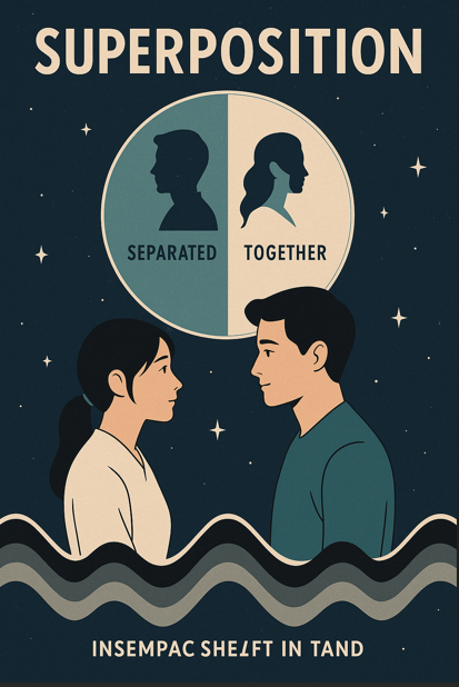 ‘Superposition(중첩)’이라는 키워드 아래, 현실에선 떨어져 있지만 마음으론 함께 있는 두 사람의 상태를 양자역학처럼 시각화한 그림이에요. ‘Seperated vs Together’의 이중성 속에서, 사랑이 동시에 존재할 수 있다는 철학적 개념을 감각적으로 담아낸 일러스트죠.