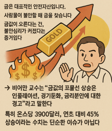 👉 비어만 교수는 “금값의 포물선 상승은 인플레이션, 경기둔화, 금리불안에 대한 경고”라고 말합니다.